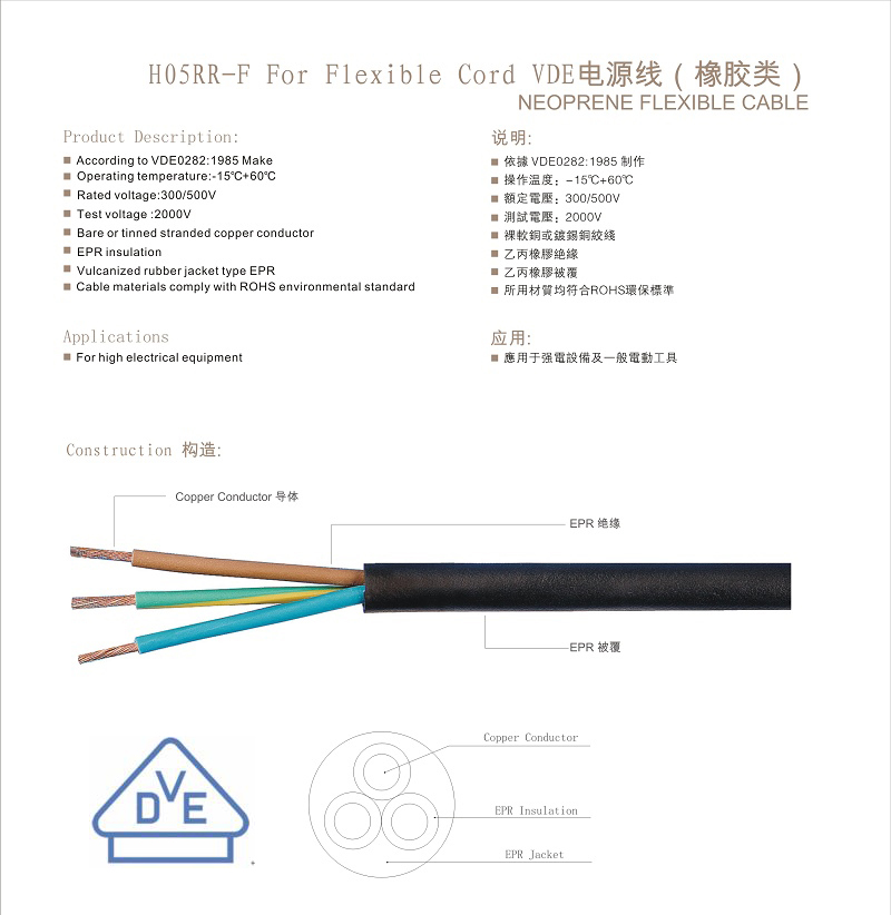 欧式VDE认证 H05RR-F 橡胶线规格如下: