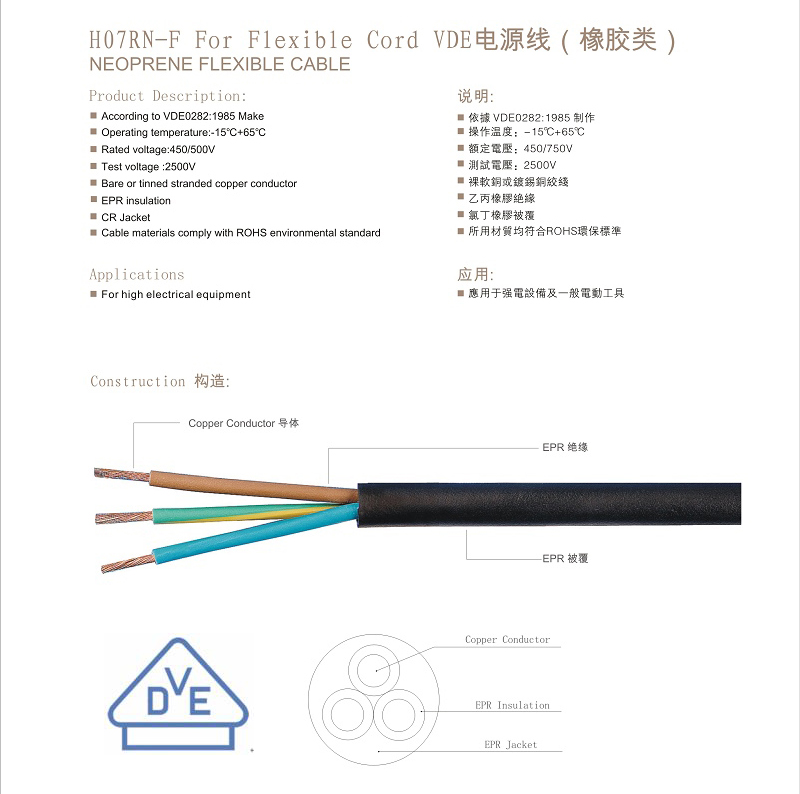 VDE认证 H07RN-F H07RR-F 橡胶线规格如下: