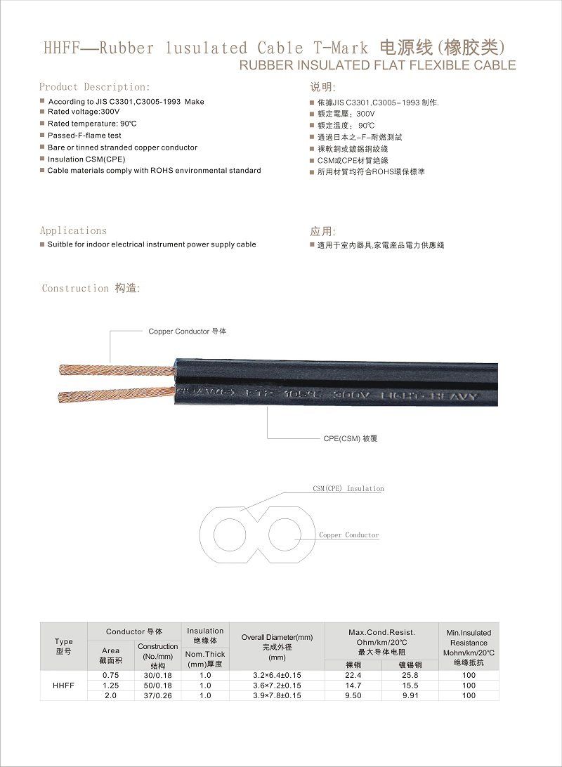 日本PSE/JET认证 HHFF橡胶线规格如下:
